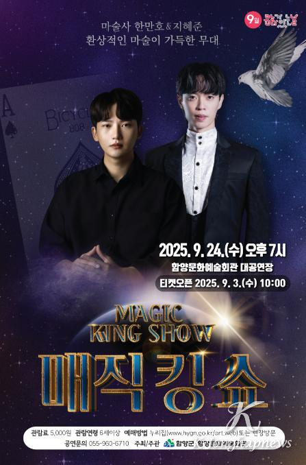 함양문화예술회관은 9월 문화가 있는 날을 맞아 오는 9월 24일(수) 오후 7시, 대공연장에서 ‘한만호 & 지혜준 매직킹 쇼’를 개최한다고 밝혔다.