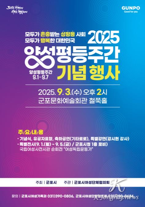군포시는 9월 3일 군포문화예술회관 철쭉홀에서 양성평등주간을 맞아 군포시 여성단체협의회 주관으로 군포시민 모두가 참여 가능한 양성평등주간 기념행사를 개최한다.