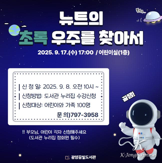 광양시 광양꿈빛도서관은 독서의 달을 맞아 오는 9월 17일 오후 5시, 도서관 어린이실에서 어린이와 가족 100명을 대상으로 특별공연 ‘뉴트의 초록 우주를 찾아서’를 운영한다고 밝혔다.