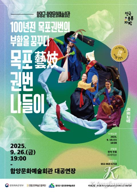 함양군문화예술회관은 오는 9월 26일(금) 오후 7시, 대공연장에서 ‘100년 전 목포권번의 부활을 꿈꾸다.  ' 목포 예기 권번 나들이’ 공연을 개최한다고 밝혔다.