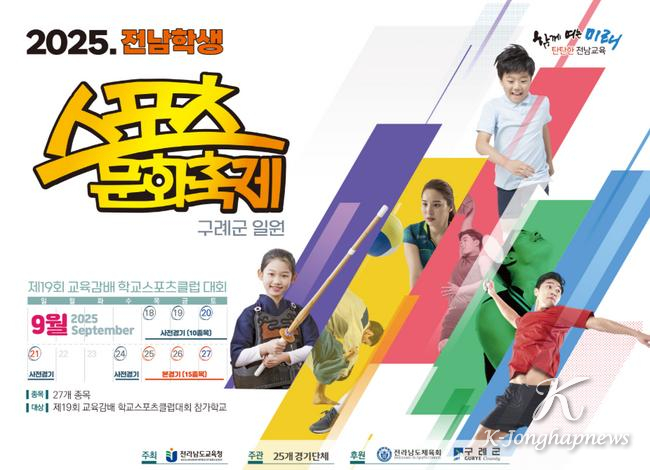 전라남도교육청이 주최하는 2025 전남 학생 스포츠 문화축제가 오는 9월 25일부터 9월 27일까지 구례군 일원에서 개최된다.