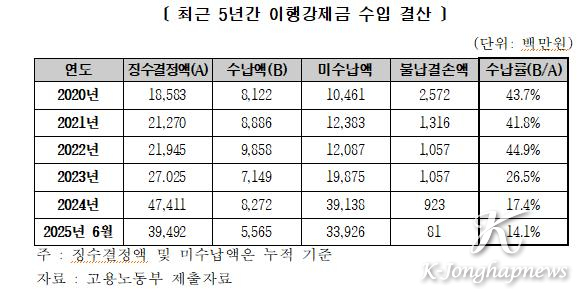 고용노동부의 올해 6월 말까지 이행강제금 수납실적이 사상 최하인 것으로 확인. 2023년 처음 20%대로 떨어진 이후 2024년 17.4%를 기록했고, 올해 6월 기준 14.1%를 기록.