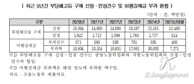 노동위원회에 부당해고등 구제 신청 및 인정건수도 2021년 14,008건 이후 매년 증가. 2024년 21,181건(인정 1,727건)으로 최근 5간 내 가장 많은 신청 건수 기록.