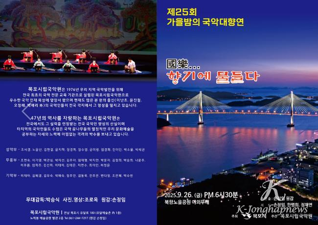 목포시립국악원(원감 손정임)은 오는 26일 오후 6시 30분, 북항 노을공원 야외무대에서 제25회 가을밤의 국악대향연을 개최한다.