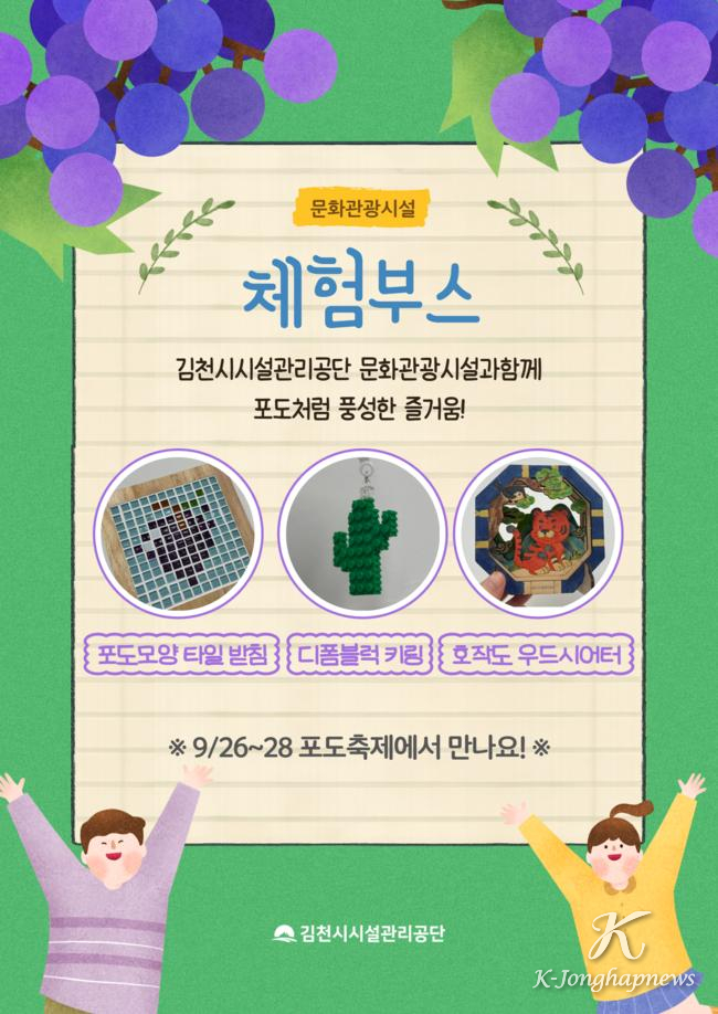 김천시시설관리공단(이사장 김재광)은 오는 9월 27일부터 29일까지 김천 종합운동장에서 열리는 ‘2025 김천 포도축제’에 참여해 문화관광시설 체험부스를 운영한다.