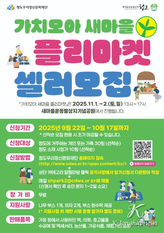 청도우리정신문화재단은 오는 11월 1~2일(토·일) 양일간, 청도 새마을운동발상지기념공원 일원에서 개최되는 ‘2025 가치모아 새마을 플리마켓’의 셀러(판매자) 참가자를 모집한다고 밝혔다.