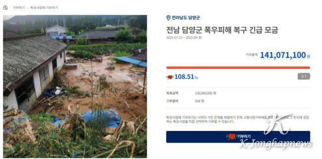 담양군(군수 정철원)은 지난 7월 특별재난지역 선포에 따라 추진한 고향사랑기부제 지정기부사업 ‘폭우피해 복구 긴급 모금’이 군민과 기부자의 동참 속에 목표액 1억 원을 조기 달성했다고 밝혔다.