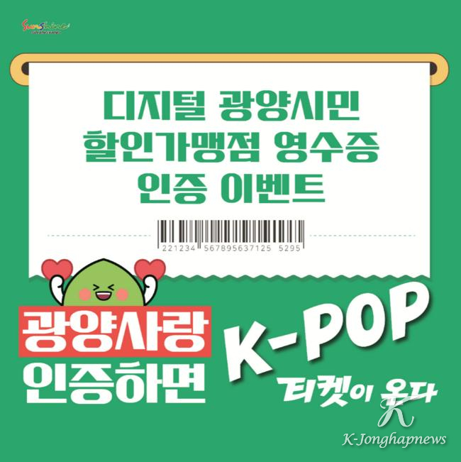 ▲디지털 광양시민 할인가맹점 영수증 인증 두 가지 방식으로 참여할 수 있으며, 당첨자에게는 10월 17일과 18일 열리는 제5회 광양 K-POP 페스티벌 지정석 입장권이 제공된다.