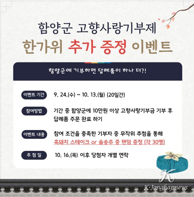 함양군은 오는 10월 13일까지 지역경제 활성화를 위하여 추석 명절맞이 고향사랑기부제 답례품 추가 증정 이벤트를 실시한다고 밝혔다.