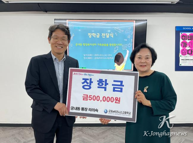 라의숙 군포시 궁내동통장협의회장은 10월 1일 군포e비즈니스고등학교에 장학금을 전달하며 지역 청소년들의 꿈을 응원하는 뜻깊은 나눔을 실천했다.