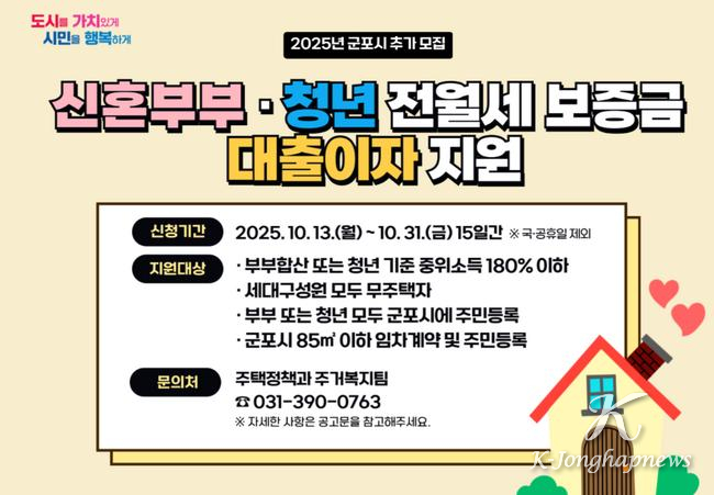 하은호 군포시장은 "이번 추가 모집을 통해 신혼부부와 청년들의 주거비 부담을 덜고, 군포시에 안정적으로 정착하여 삶의 질을 향상시킬 수 있기를 기대한다"며 "관내 신혼부부와 청년들의 많은 관심과 신청을 바란다"고 말했다.