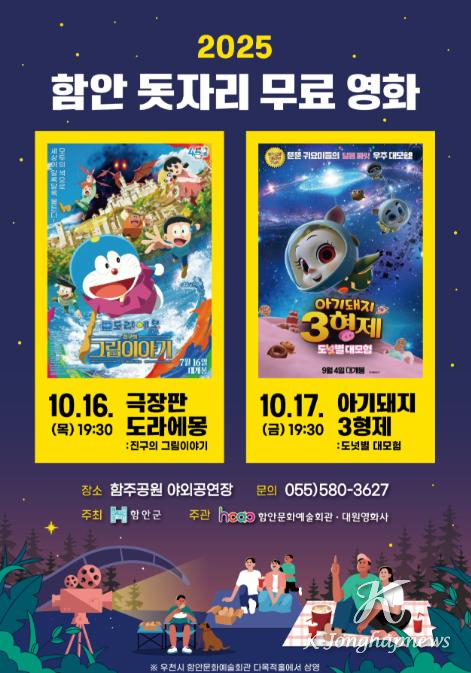 함안문화예술회관은 군민에게 영상문화를 즐길 기회를 제공하기 위해 10월 16일과 17일 오후 7시 30분 함주공원 야외공연장에서 ‘함안 돗자리 무료영화’를 운영한다고 밝혔다.