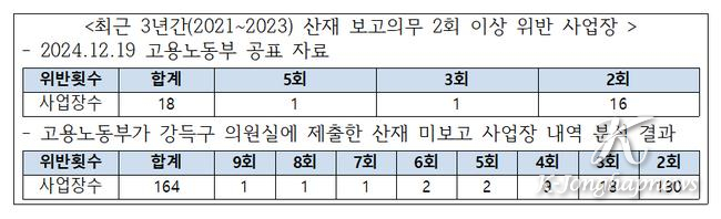 이에 따라 작년 12월에 2021년부터 2023년까지 산재 보고의무를 2회 이상 위반한 사업장 18곳이 공표됐다.