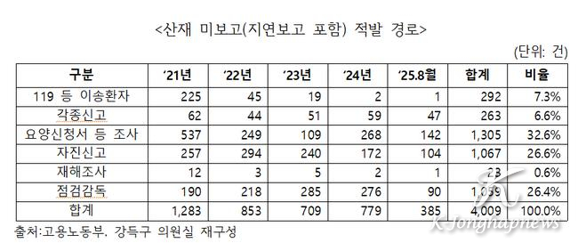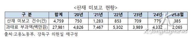 2020년 이후 올해 8월까지 산재 보고의무 위반 적발 건수는 총 4,759건, 부과된 과태료는 279억 원, 건당 평균 과태료는 587만 원이다.