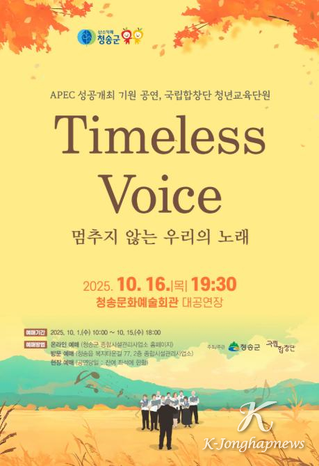 청송군(군수 윤경희)은 오는 16일 저녁 7시 30분, 청송문화예술회관 대공연장에서 APEC 성공개최를 기원하는 국립합창단 청년교육단원 공연 ‘Timeless Voice – 멈추지 않는 우리의 노래’를 개최한다.