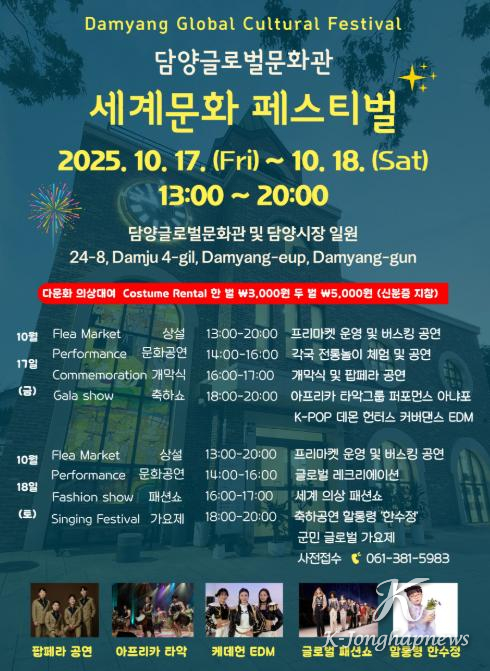 담양군(군수 정철원)은 오는 17일부터 이틀간 담양글로벌문화관과 담양오일시장 일원에서 ‘세계문화페스티벌’을 연다고 밝혔다.