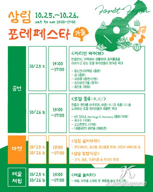 ‘상림 문화놀이장날’의 새로운 이름으로 지난 4월 첫선을 보인 ‘상림 포레 페스타 <봄>’편에 이어 <가을> 편이 오는 10월 25일(토)과 26일(일) 이틀간 오후 1시부터 5시까지 함양문화예술회관 앞마당에서 열린다.