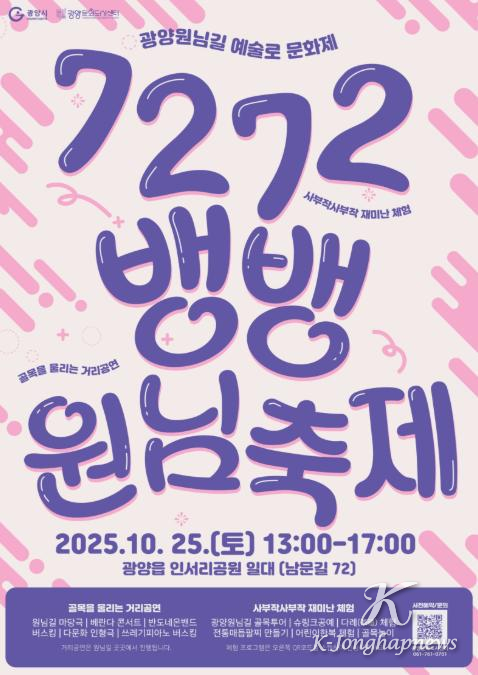 광양문화도시센터(센터장 박시훈, 이하 ‘센터’)는 오는 10월 25일(금) 오후 광양읍 인서리공원 일대에서 광양원님길 브랜드 축제 ‘7272뱅뱅원님축제’를 개최한다고 밝혔다.