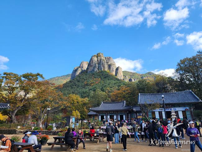 인파가 몰린 대전사에서 바라본 ㄱ을의 기암단애(2024. 11. 3. 촬영)