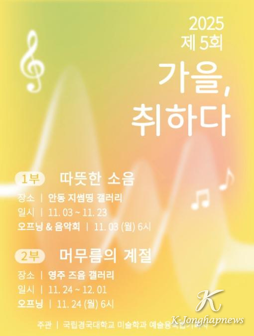 올해로 5회째를 맞는 이번 행사는 ‘따뜻한 소음’ ‘머무름의 계절’이라는 두 개의 부제를 중심으로 진행한다. 특히 올해는 국립경국대로 교명이 변경된 이후 처음으로 열리는 ‘가을, 취하다’ 전시로, 학생에게는 새로운 이름 아래에서 맞이하는 첫 무대이자, 학교의 예술적 정체성을 새롭게 다지는 뜻깊은 자리가 될 전망이다.