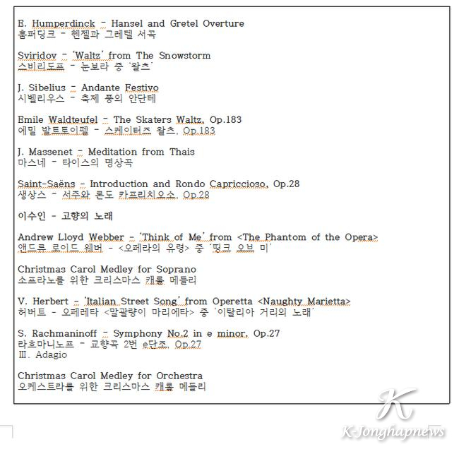 또한 국내외 무대에서 활약 중인 소프라노 강혜정이 한국 고유의 정서가 담긴 이수인의 ‘고향의 노래’, 뮤지컬 명작 <오페라의 유령> 중 ‘띵크 오브 미’, 크리스마스 캐롤 메들리, 오페레타 <말괄량이 마리에타> 중 ‘이탈리안 스트릿 송’ 등을 노래하며, 다채로운 감성을 더할 예정이다. 마지막으로 라흐마니노프 교향곡 2번 중 3악장, 그리고 오케스트라를 위한 크리스마스 캐롤 모음곡이 연주되며, 공연이 마무리된다.