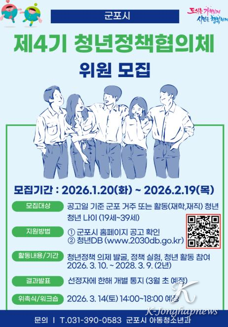 군포시(시장 하은호)는 제4기 군포시 청년정책협의체 위원을 오는 2월 19일(목)까지 모집한다고 밝혔다.