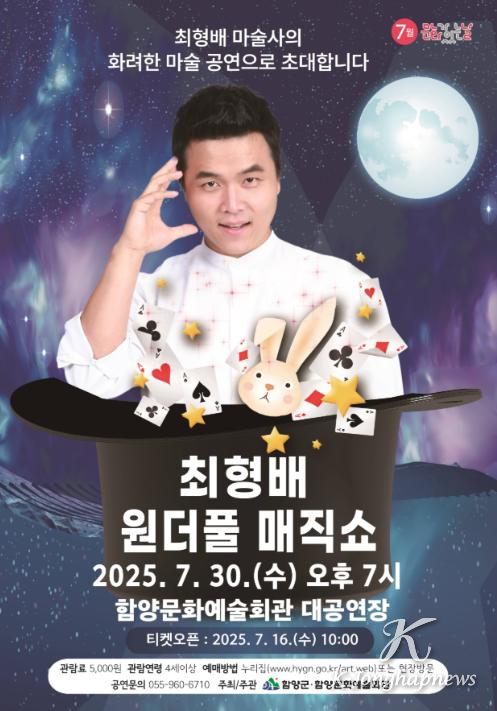 함양군은 7월 ‘문화가 있는 날’을 맞아 오는 30일(수) 오후 7시 함양문화예술회관 대공연장에서 국내 정상급 마술사 최형배가 출연하는 ‘최형배 원더풀 매직쇼’를 개최한다.