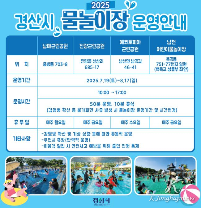 조현일 경산시장은 “도시공원 내 4개소에 물놀이장을 무료로 개장해 어린이와 시민 모두가 무더위를 잠시 잊고 즐길 수 있는 도심 속 휴식 공간을 제공할 계획”이라며, “운영기간 동안 안전사고 예방에 최선을 다하겠다”고 전했다.