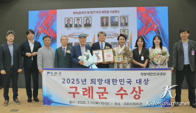 이번 시상식은 광복 80주년과 제77주년 제헌절을 기념해 국회의원회관에서 개최됐으며, 희망대한민국대상위원회는 지방소멸 위기 대응 및 지역발전의 성과를 높이 평가해 구례군을 지자체 부문 대상으로 유일하게 선정했다.