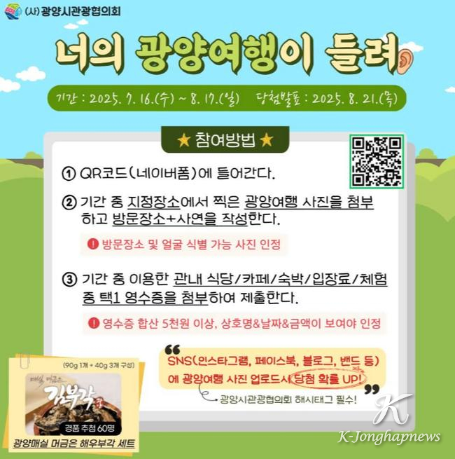당첨자는 8월 21일 (사)광양시관광협의회 홈페이지와 공식 인스타그램을 통해 발표되며, 경품은 발표일로부터 7일 이내에 개별 발송될 예정이다.