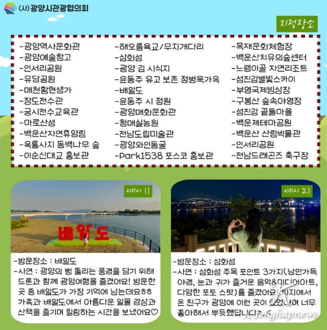 광양시는 본격적인 여름휴가철을 맞아 (사)광양시관광협의회와 함께 ‘너의 광양여행이 들려’ 인증 이벤트를 진행한다고 22일 밝혔다.