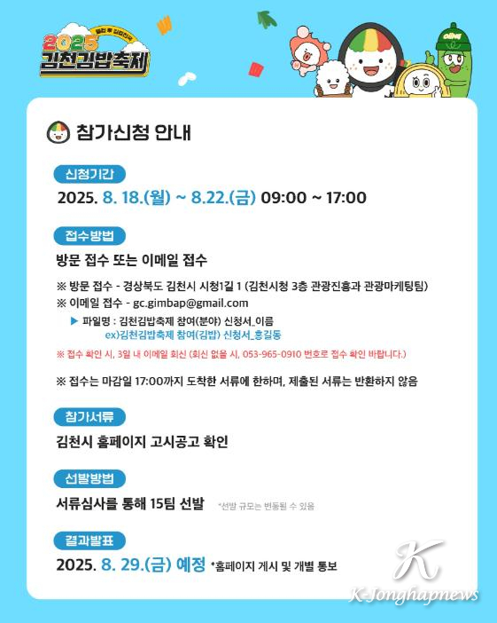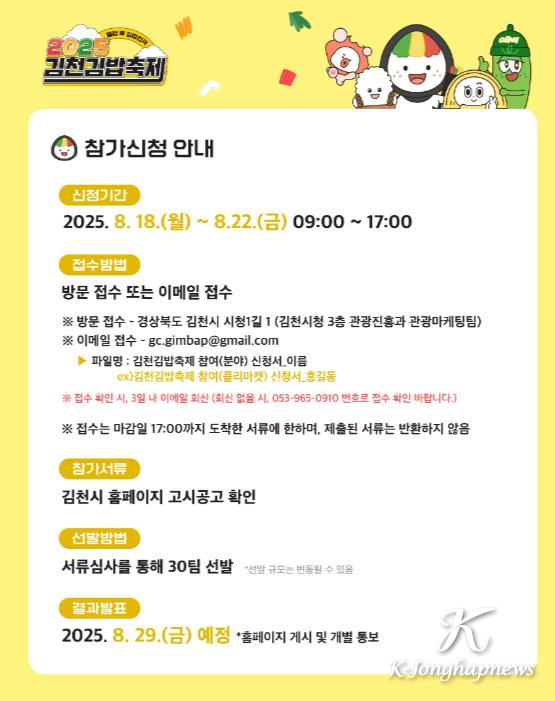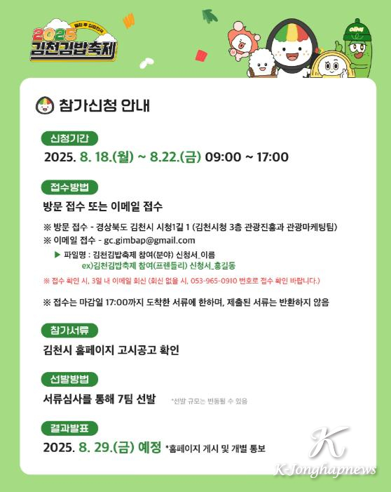 신청 방법 및 주요 일정은 시 누리집(홈페이지) 또는 SNS를 통해 확인이 가능하며, 기타 사항은 김밥축제 대행사(☎053-965-0910) 또는 김천시 관광진흥과(☎054-420-6637)로 문의하면 된다.
