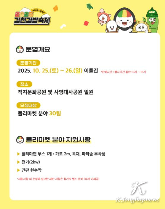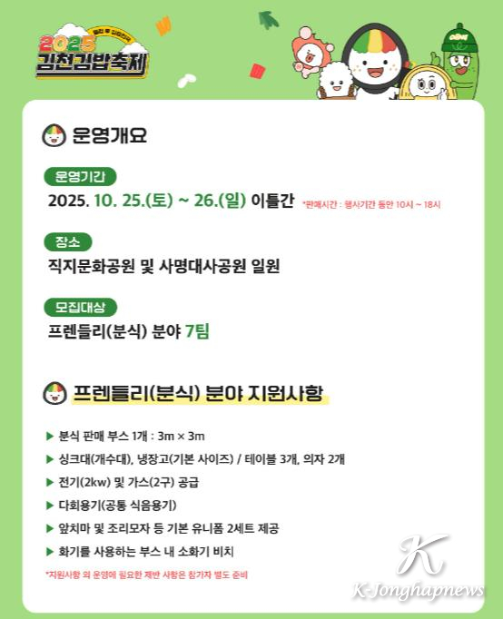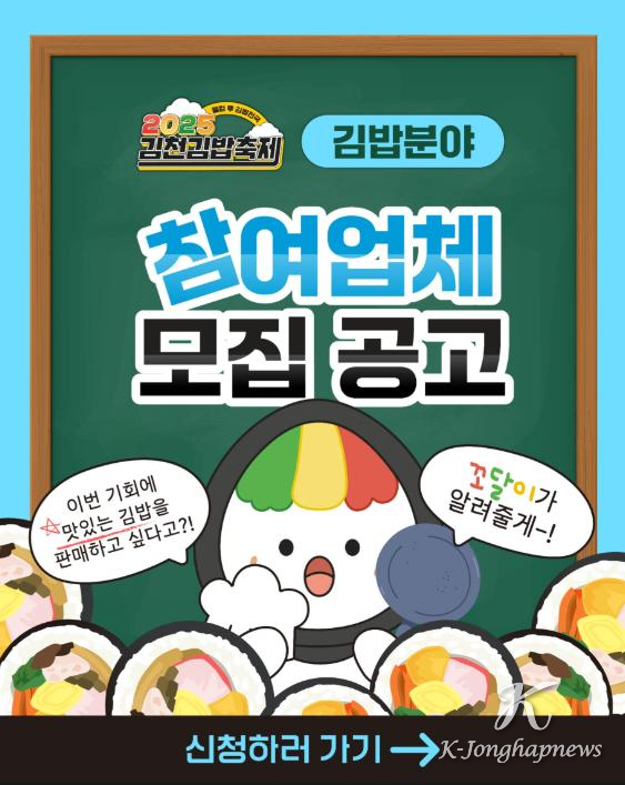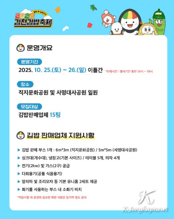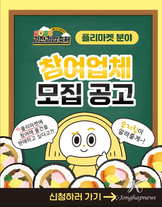 김천시(시장 배낙호)는 10월 25일부터 26까지 양일간 직지문화공원 및 사명대사공원 일원에서 열리는 『2025 김천김밥축제』를 앞두고, 행사에 함께할 업체를 모집한다고 밝혔다.