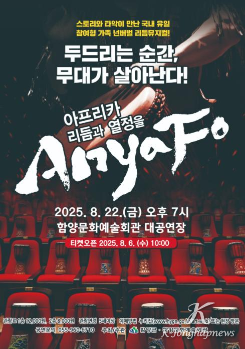 함양문화예술회관 관계자는 “아프리카의 다채롭고 생동감 넘치는 퍼포먼스와 젬베의 폭발적인 에너지가 어우러져 무더운 여름밤을 시원하게 날려줄 특별한 시간이 될 것”이라며 많은 관심과 성원을 당부했다.