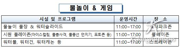 워터파크존에는 대형 슬라이드, 물놀이장, 에어바운스 등 다양한 시설이 마련되어 남녀노소 누구나 물놀이를 즐길 수 있었으며, 스프레이존에서는 사방에서 뿜어져 나오는 시원한 물줄기 속에서 물총 놀이를 즐기며 더위를 식힐 수 있도록 했다. 또한 플레이존에서는 아이스 컬링과 물풍선 던지기 등 온 가족이 함께할 수 있는 체험 프로그램이 운영돼 방문객들의 큰 호응을 얻었다.