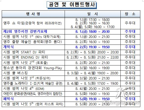 축제는 다양한 세대가 함께 즐길 수 있는 공연 프로그램으로 채워진다. 8월 2일(토)에는 영주 출향예술인들의 ‘영주 품다’ 공연과 김현정과 쿨(이재훈)이 출연하는 ‘토토즐 콘서트’가 펼쳐진다. DJ EDM파티가 오프닝과 클로징을 장식하며 젊은 세대의 감성을 자극할 예정이다.