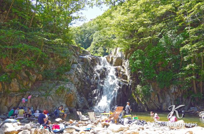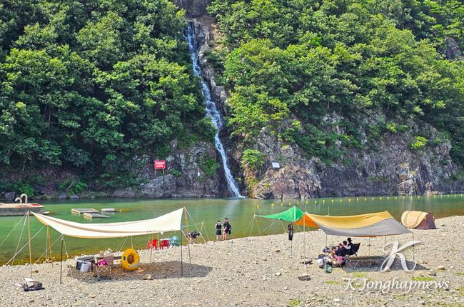 폭포 주변에는 넓은 계류와 하천변 공간이 마련돼 있어, 물놀이와 야영을 동시에 즐기려는 피서객들에게 큰 인기를 끌고 있다.