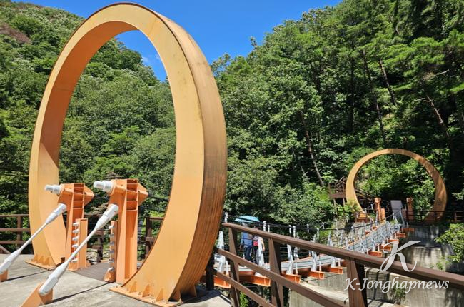 또한 폭포 앞으로는 덱 계단이 설치돼 있어 쉽게 접근할 수 있으며, 계곡을 가로지르는 오렌지빛 출렁다리는 초록 숲과 어우러져 이색적인 풍경을 연출한다.