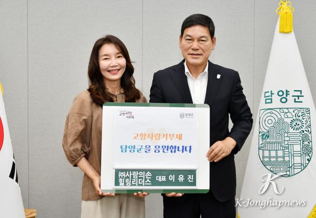 담양군(군수 정철원)은 지난 19일 이유진 사랑의 손 힐링리더스 대표가 고향사랑기부를 통해 담양에 따뜻한 마음을 전했다고 밝혔다.