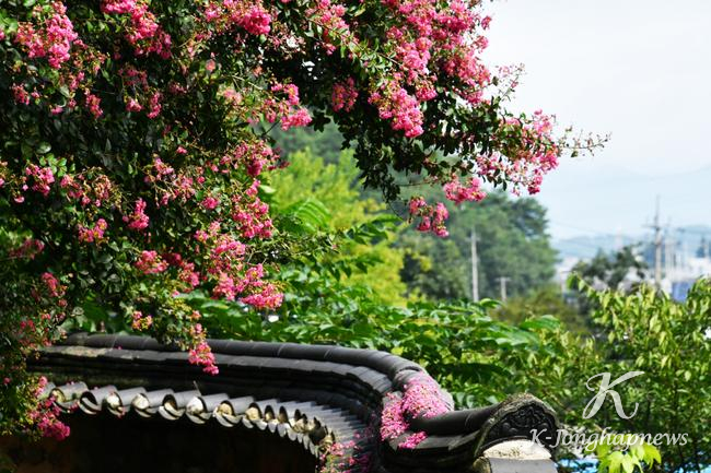 담양 죽림재에 백일홍이 활짝 피어 여름 정취 속에 붉은 꽃물결이 장관을 이루고 있다.