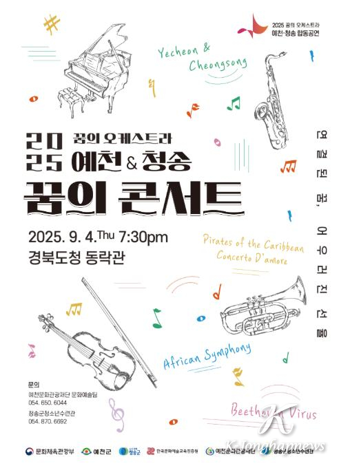 (재)예천문화관광재단(이사장 김학동 예천군수)이 운영하는 ‘꿈의 오케스트라 예천’과 청송군청소년수련관의 ‘꿈의 오케스트라 청송’이 오는 9월 4일 경북도청 동락관에서 합동연주회 꿈의 콘서트를 개최한다.