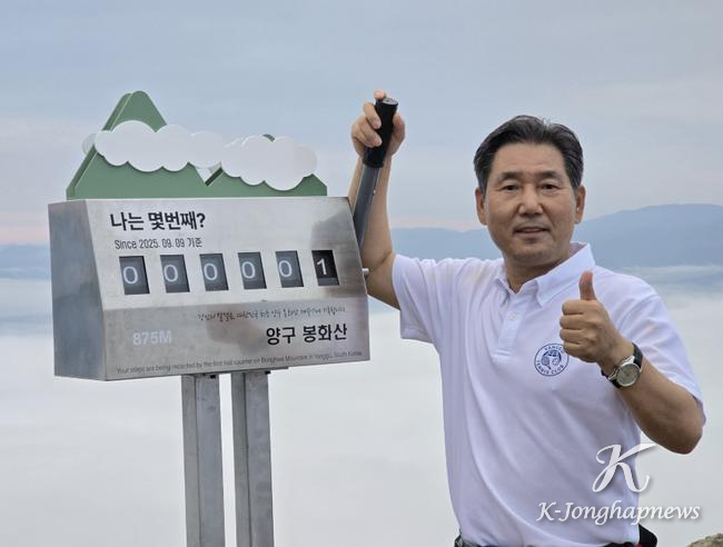 양구군은 9일 대한민국 국토의 정중앙에 위치한 봉화산 정상에서 전국 최초로 설치된 '산악 등정 계수기' 준공식을 개최했다.