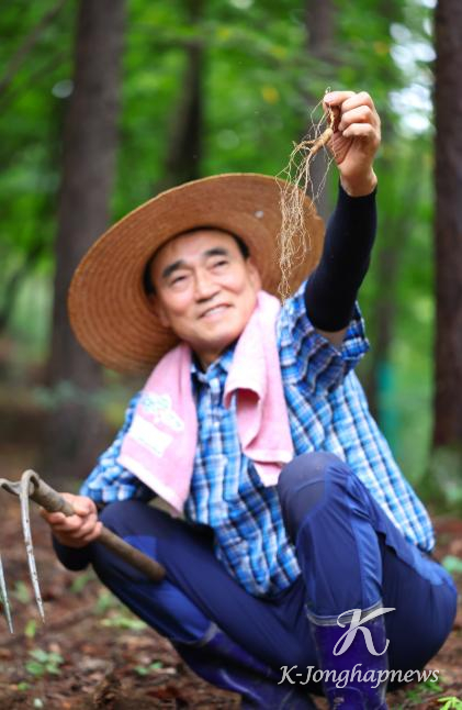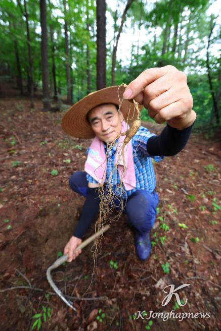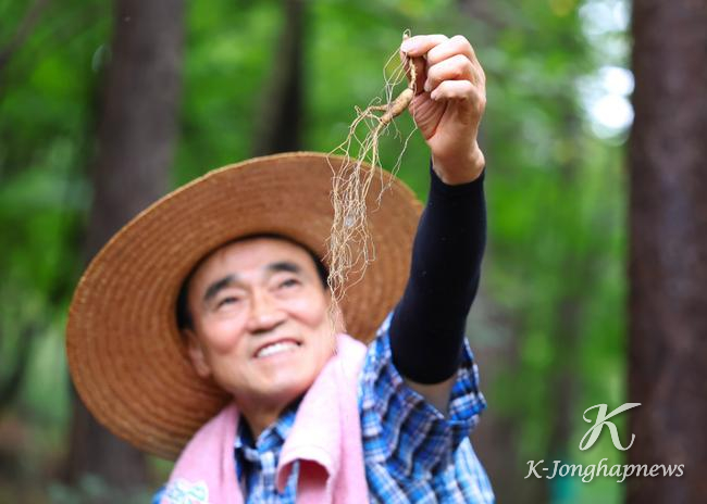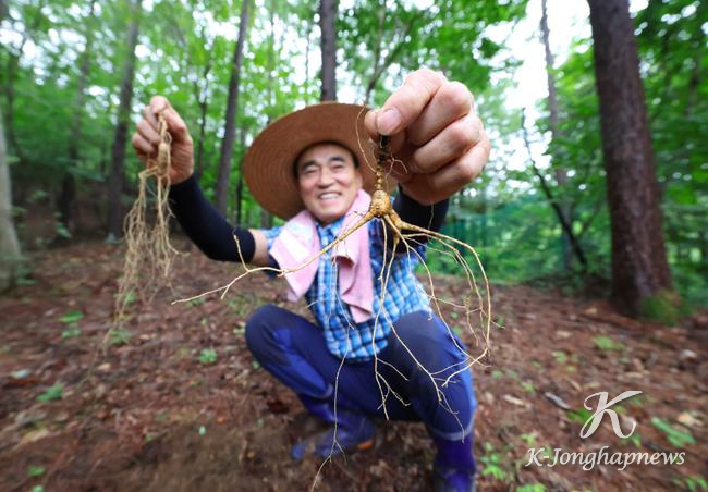 '제20회 함양산삼축제'를 앞둔 11일 경남 함양군 서하면 행상농원 산삼재배 농가에서 오선택씨가 함양산삼축제에 선보일 산삼을 캔 뒤 들어보이고 있다. ‘제20회 함양산삼축제’는 오는 18일부터 22일까지 닷새동안 상림공원 일원에서 열린다.