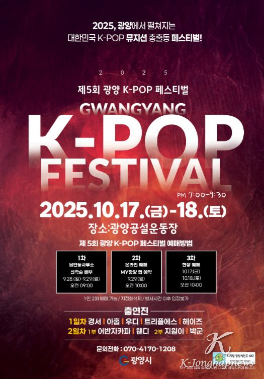 제5회 광양 K-POP 페스티벌은 오는 10월 17일과 18일, 양일간 광양공설운동장 일원에서 화려한 라인업으로 전국 청소년 댄스 경연대회와 함께 성대하게 개최된다.