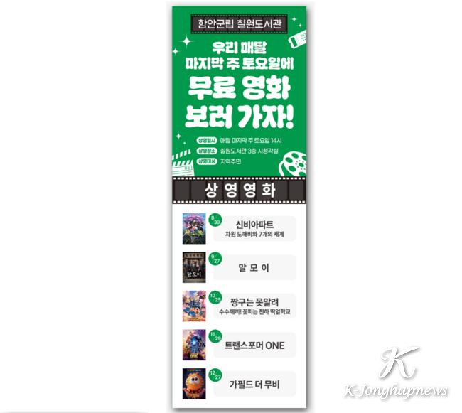 함안군립 칠원도서관은 매달 마지막 주 토요일 오후 2시에 열리는 무료 영화 상영 프로그램을 더 많은 군민이 즐길 수 있도록 적극적으로 홍보하고 있다고 밝혔다.