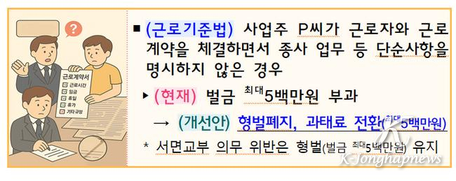 (근로기준법) 근로계약 체결시 종사업무 등 단순명시 사항을 명시하지 않은 경우 現벌금 최대5백만원→改과태료 최대5백만원