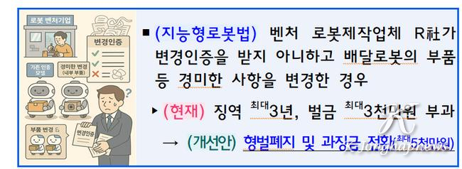 (지능형로봇법) 배달로봇 등 실외이동로봇의 부품 등 경미한 사항을 사전 승인없이 개조한 경우 現징역 최대3년·벌금 최대3천만원→改형벌폐지·과징금 최대5천만원