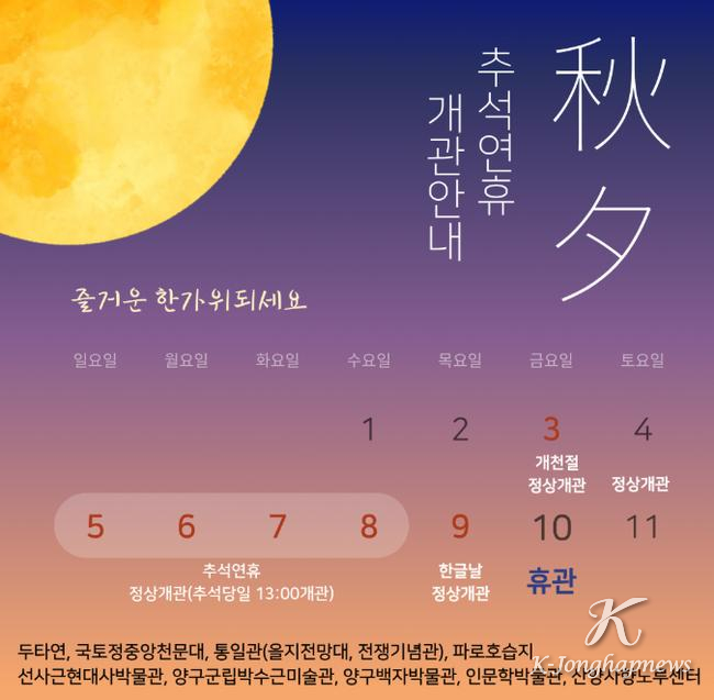 서흥원 양구군수는 “추석 명절을 맞아 지역주민들과 양구를 방문하시는 귀성객, 관광객들께서 더욱 즐겁고 행복한 연휴를 보낼 수 있도록 다양한 행사를 준비했다”라며 “양구의 관광명소도 즐기시면서 소중한 추억을 만드시길 바란다”라고 말했다.