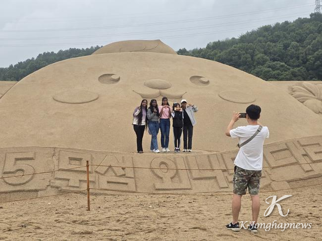 관광객들이 샌드아트 조형물 앞에서 기념사진을 찍고 있다.