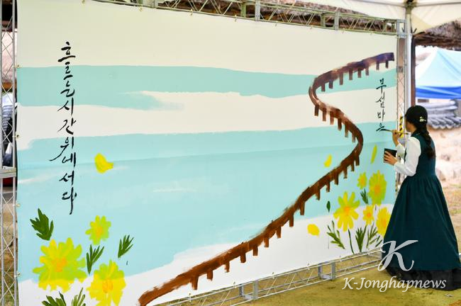 '2025영주 무섬외나무다리축제' 캘리그라피 퍼포먼스가 진행되고 있다.